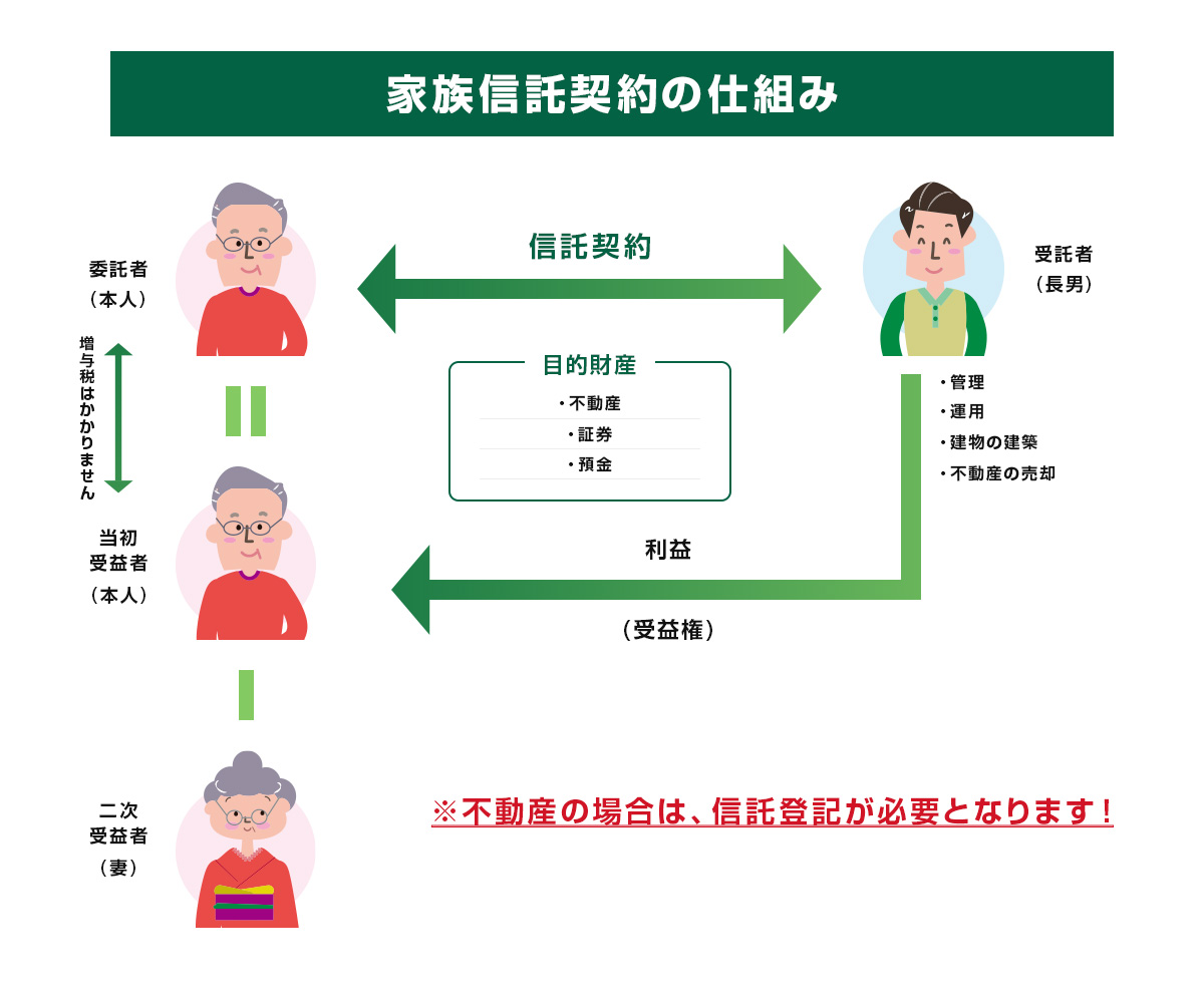 委託者(本人)が受託者(家族)に特定の財産の運用・管理・処分を託し利益は委託者が受け取る仕組みの契約です。